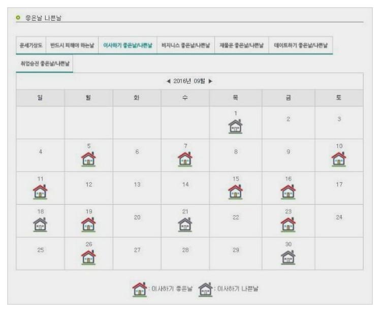 사주정보를 입력하고 ‘운세보기’를 누르면 다양한 날짜 정보가 나오게 됩니다. 그 중에서 상단의 ‘이사하기 좋은날/나쁜날’을 선택하면 자신에게 적합한 이사날을 찾아보실 수 있어요.
